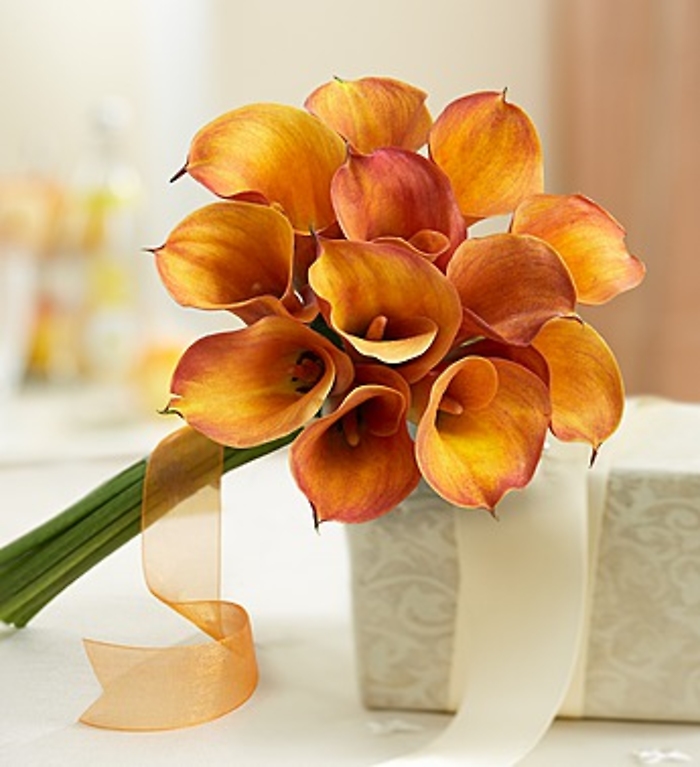 Bring a burst of color to your wedding day with this beautiful bouquet of mango mini Calla lilies. Delicately gathered by our expert florists, it’s hand-tied with matching satin ribbon for the perfect finishing touch. Available in three sizes so the bride can coordinate with her entire bridal party. And don’t forget the matching petite bouquet—an artfully designed arrangement perfect for the mother of the bride or groom, a special guest or as a toss away for the reception.